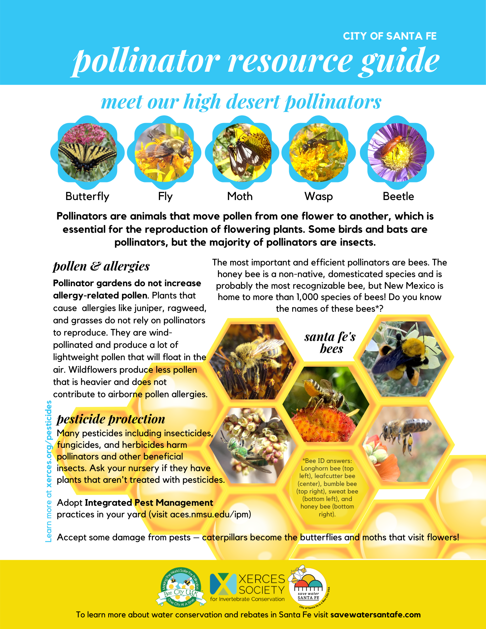 Check out our new Pollinator Resource Guide, developed in partnership with Xerces Society. Also, be sure to visit our Waterwise Landscape page for more resources about planting trees, shrubs and plants that are most appropriate for Santa Fe’s high desert environment.