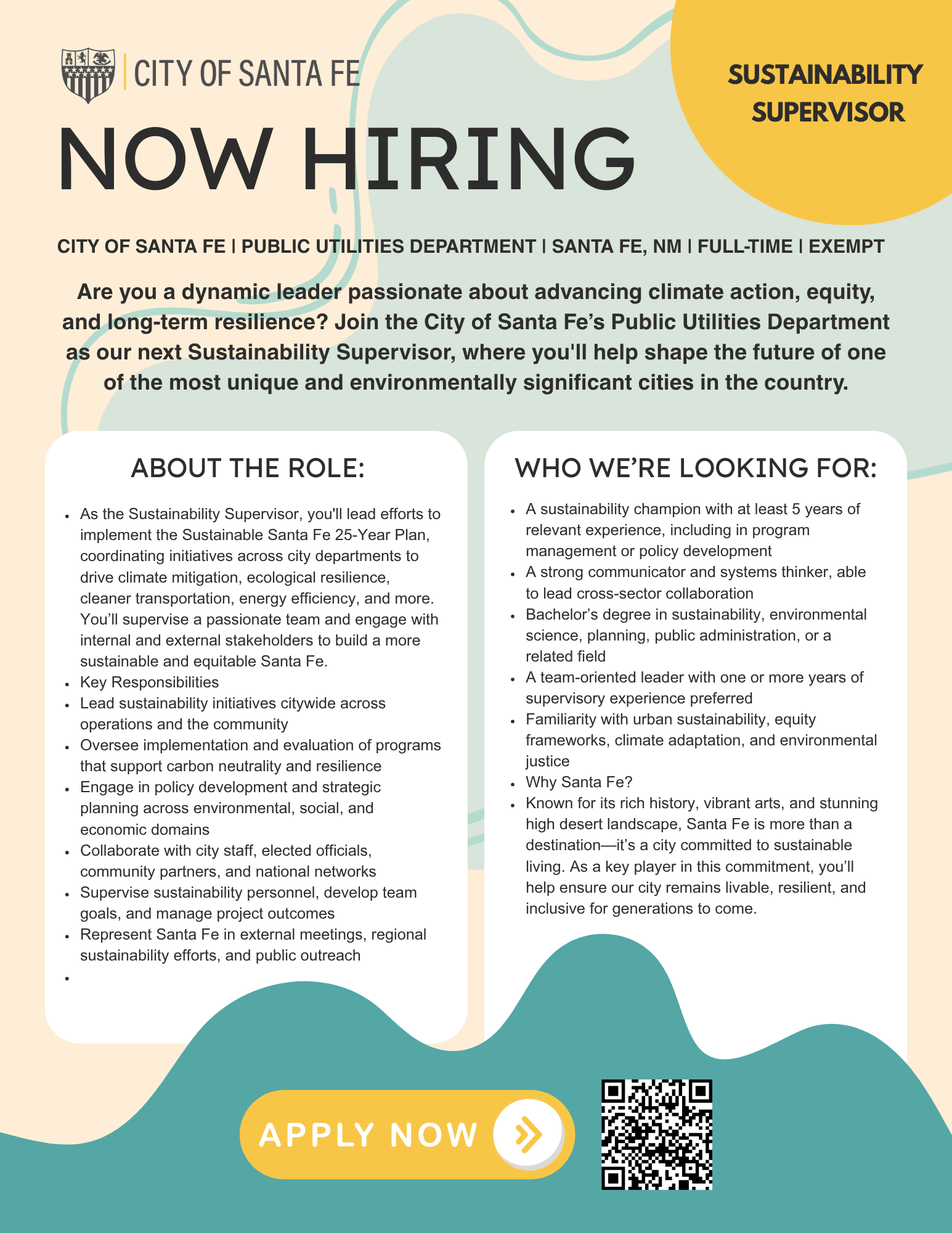 Are you a dynamic leader passionate about advancing climate action, equity, and long-term resilience? Join the City of Santa Fe’s Public Utilities Department as our next Sustainability Supervisor, where you’ll help shape the future of one of the most unique and environmentally significant cities in the country. Apply Online
